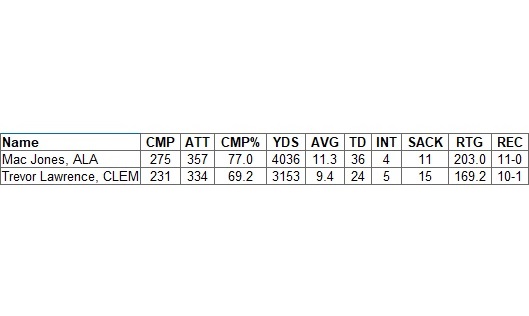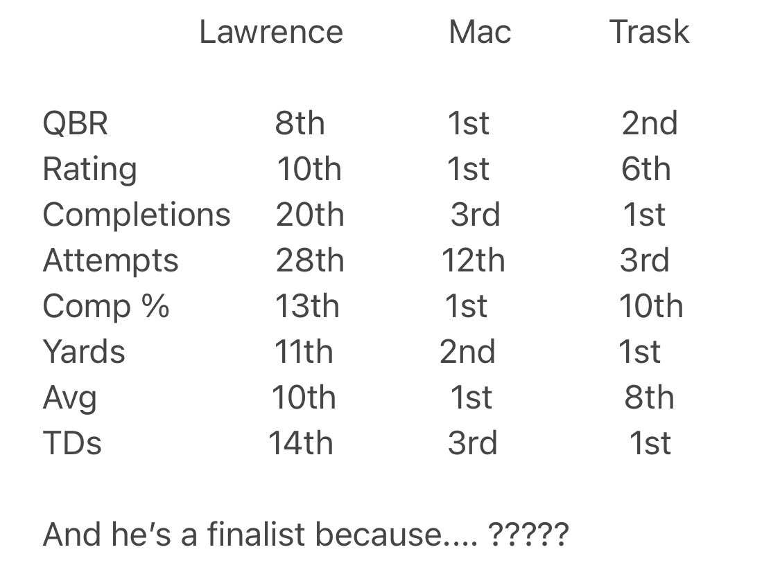 Lawrence will be drafted higher and probably be a better pro, but there is zero argument that Trevor Lawrence had a better year than Mac. He was literally worse in every passing category - totals, efficiency, per game, whatever.