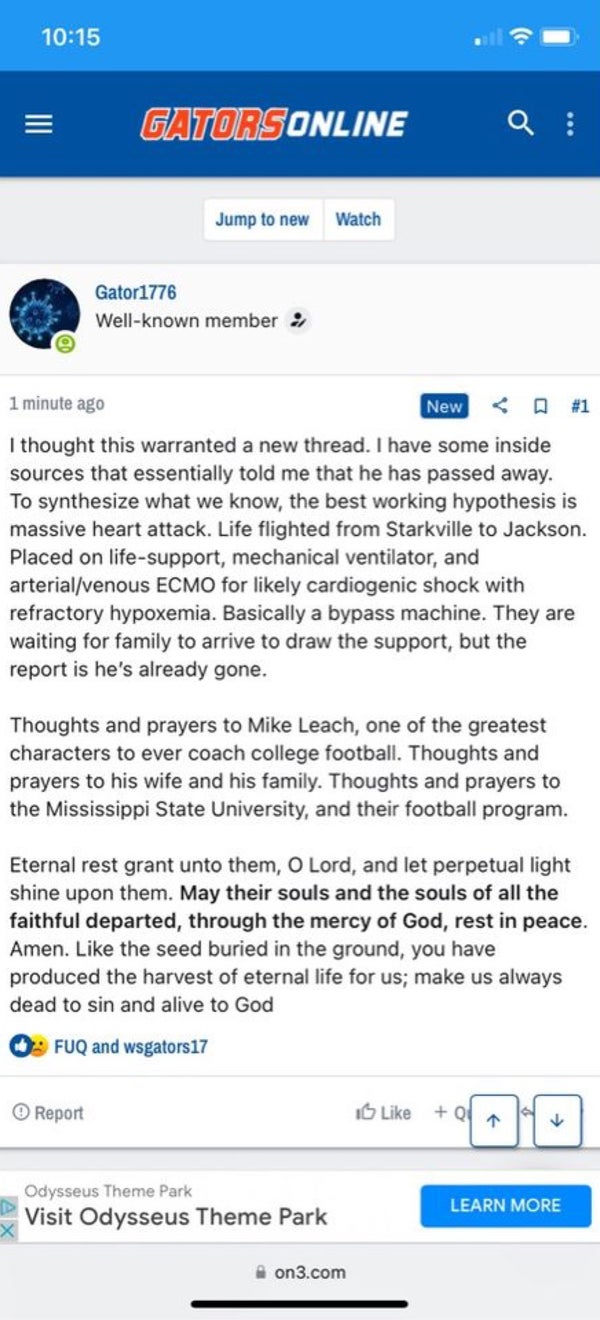 Well i woke up this morning hoping to see better news. Very sad. Praying for Coach Leach and all surrounding him right now.