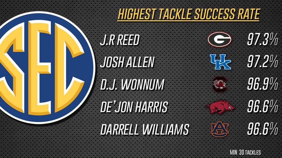 SEC players who succeed on the highest percentage of their tackle attempts: