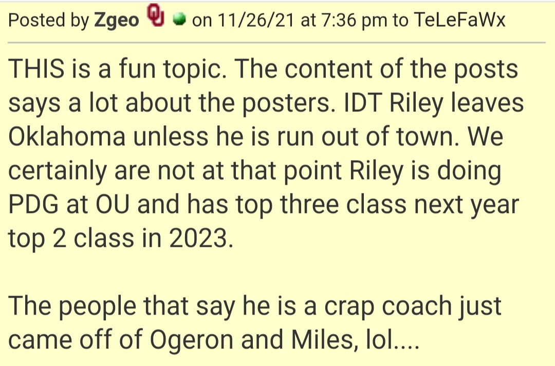 Riley. Took a playoff team and devolved it to a team that could barely get third in a down year for the Big 12 even with 2, 5 star 1 QBs and with 12 players sent to the NFL.