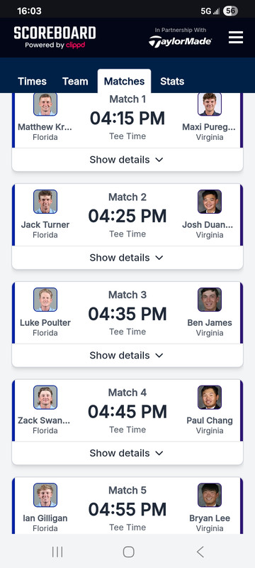 think the golf channel picks up coverage at 5CT. UF tees off vs Virginia in about 5 minutes. OK make that 1 minute.