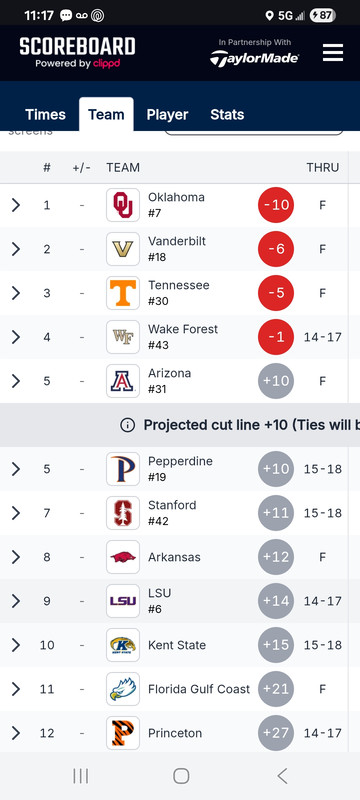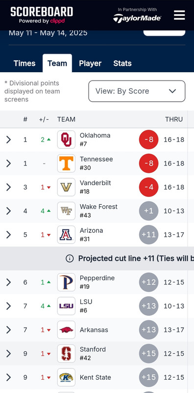 Amherst: Oklahoma, Tennessee, Vanderbilt look safe to advance. LSU has a chance. They are in 6th, 2 strokes back of Arizona.