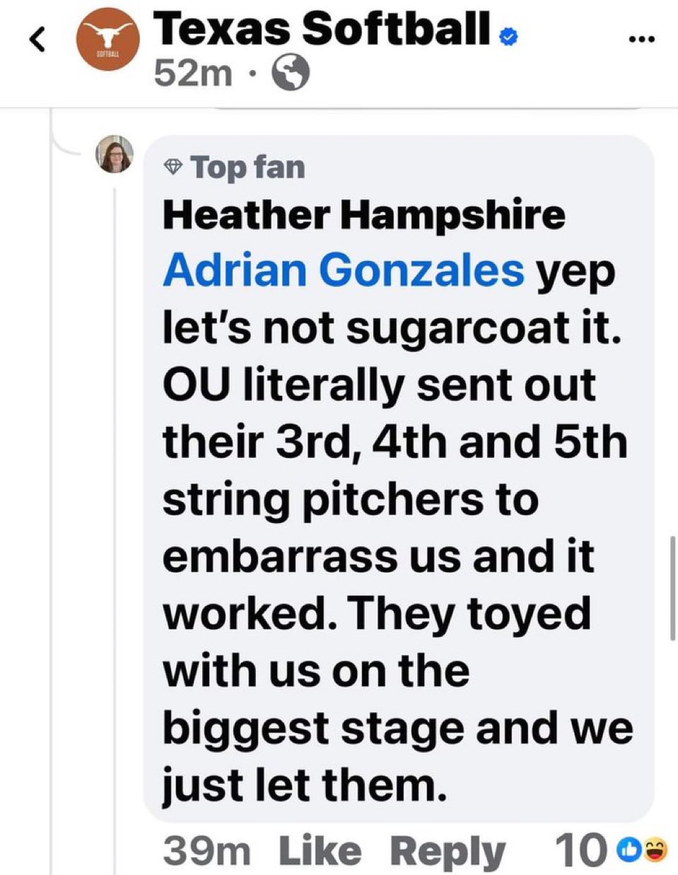 Her plan was to use other pitchers and see how the game went. If tx was beating us good then she was saving her big guns for game 3. But if OU was ahead she was willing to bring them in late to finish tx off.