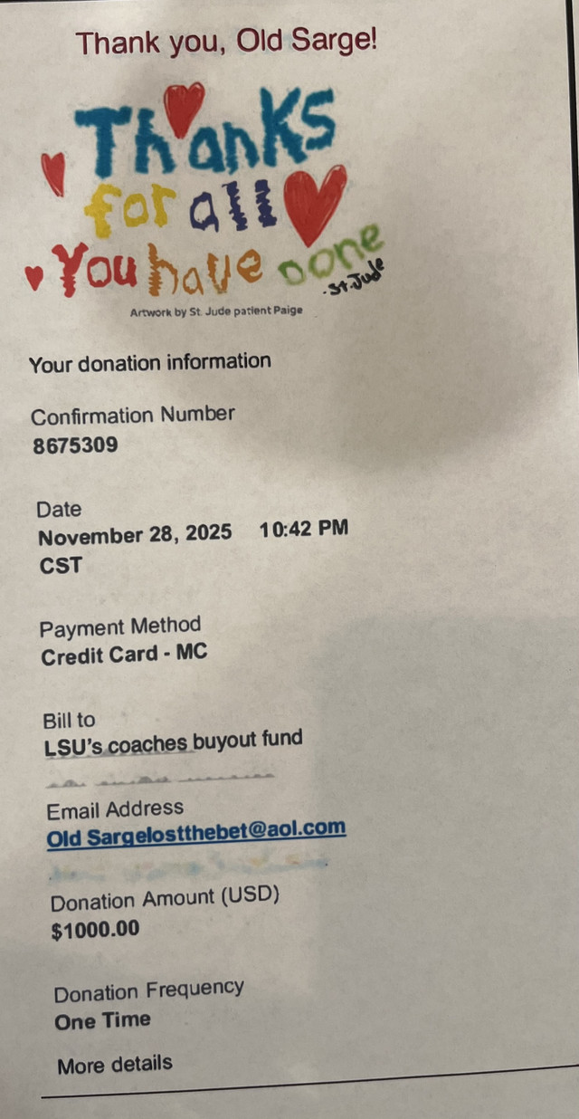 Next is the donation to St. Jude’s as agreed, thank you for being willing to participate and wagering $1000 on the Longhorns behalf. As an additional concession I will not refer to Texas as Utrans for the duration of the penalty period