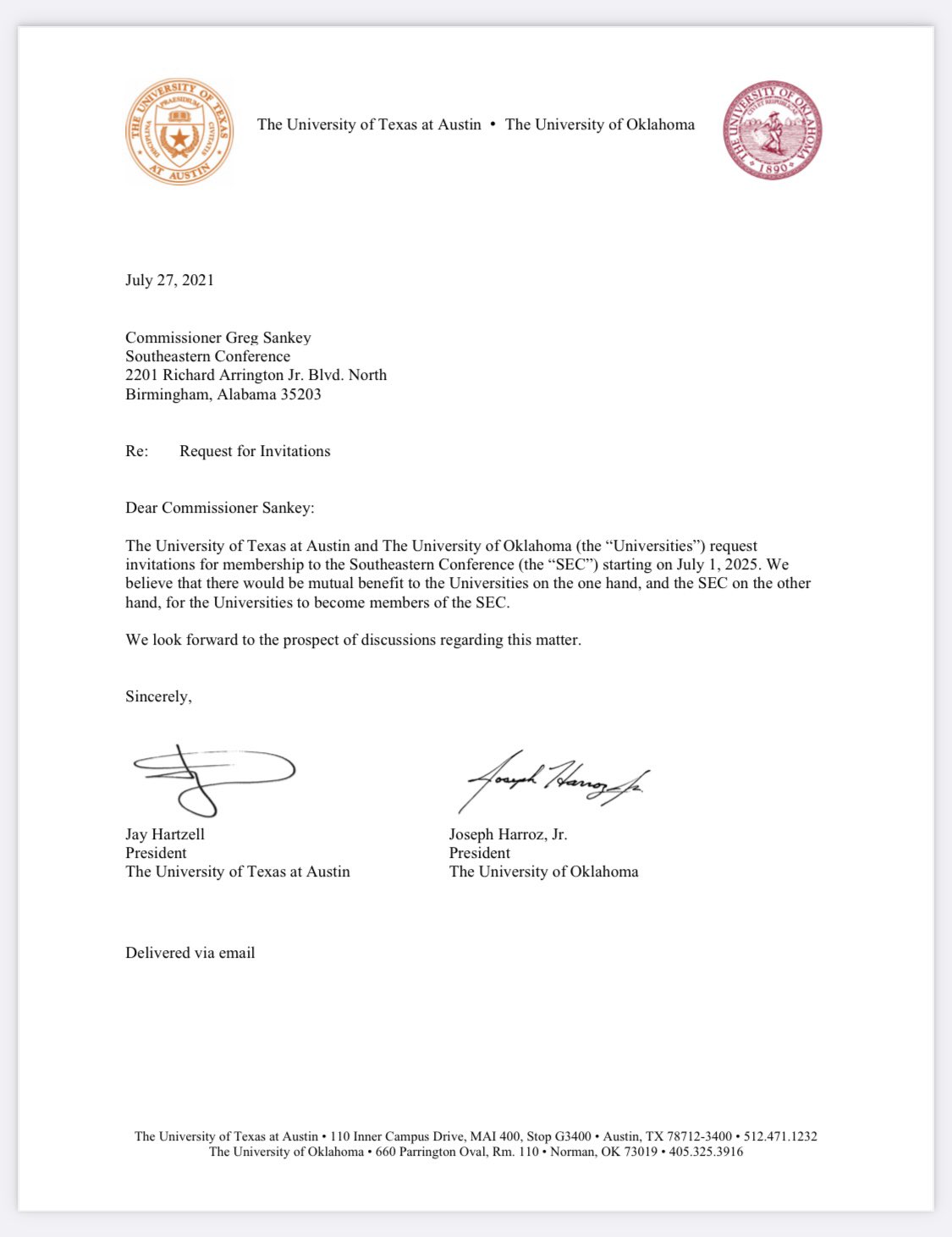 ***Oklahoma & Texas have officially applied for membership in the SEC***