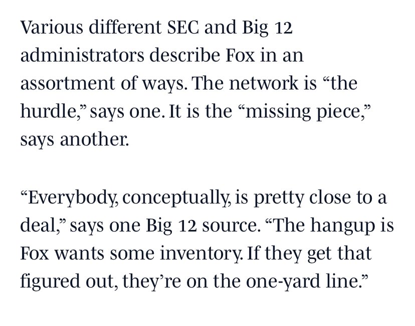 I am guessing this leak is Fox trying to get Texas and OU to budge on doing some type of scheduling agreement with the B12 to allow increased inventory as those teams are balking at the terms…