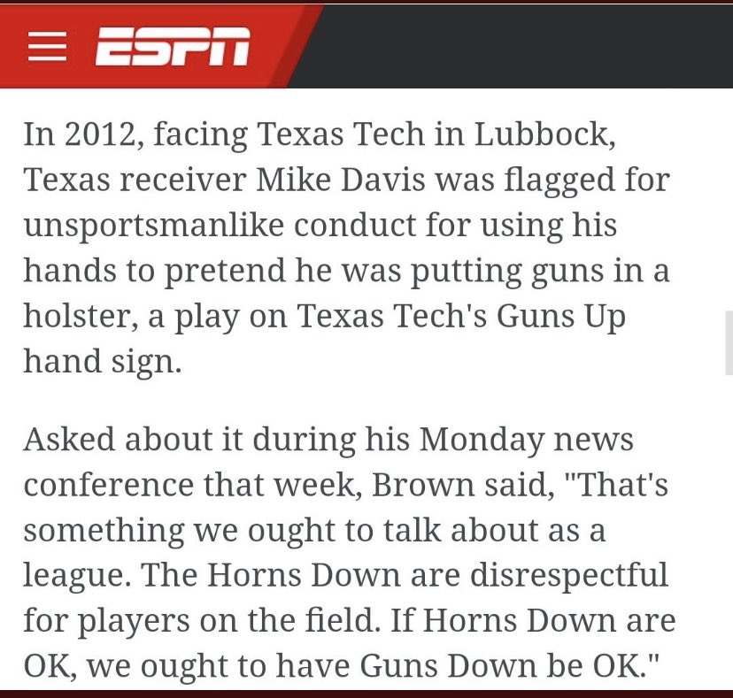 Also, this first came to attention when Texas, not the opposing team, was flagged for unsporstmanlike conduct by "holstering guns". This is from 2012: