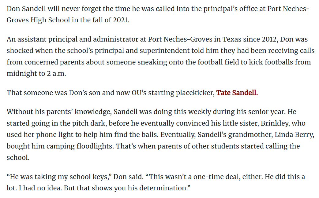A good time to bring back this story of Tate Sandell sneaking onto his high school's field in the middle of the night to practice his kicking and his grandmother buying flood lights so he could see.