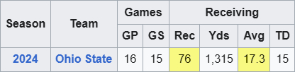 His average is propped up by the Western Kentucky game. 2 catches with a 69.5 average. He had 139 yards on 2 catches.