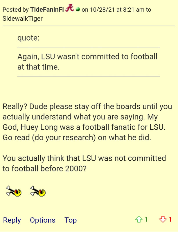 But poster TideFaninFl insisted that LSU was committed to football prior to Saban arriving in Baton Rouge because of muh Huey P. Long who died in