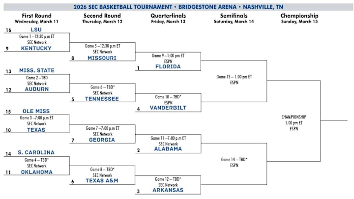 Looks like the Gators will play either Mizzu or KY in their first SECT game. Dont see LSU winning 2 SECT games.