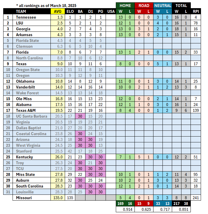re: SEC Baseball Rankings - March 10, 2025