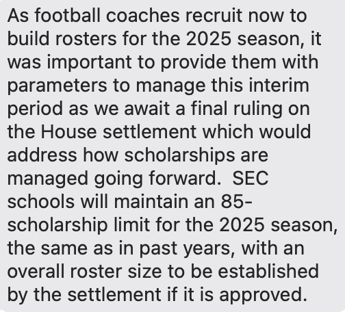 The SEC has set a football scholarship limit of 85 for 2025, the league told