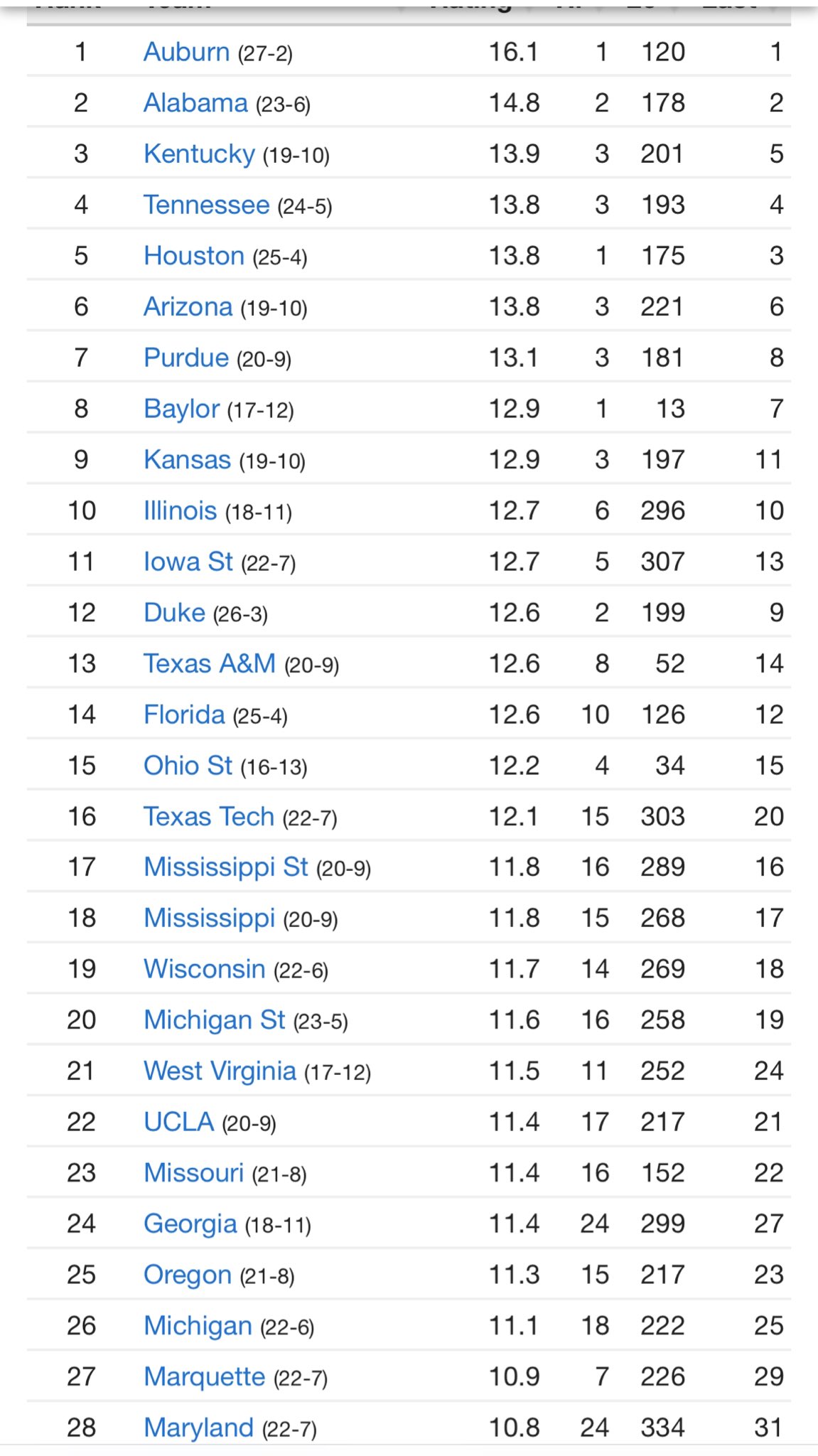 All along Georgia's issue was they just needed to either pile up multiple wins against the good/not great teams (State, Vandy, A&M) or find 1-2 huge wins likely at home (Auburn, Florida) because they had a lot of wins, no bad losses and enough solid OOC wins. They finally grabbed one of those with Florida. Likely needed to win 2 of the last 3 (maybe even just 1) after that win to get in, and they already snagged one of them in Austin. If they split the last 2 they're probably not even in Dayton. If they lose both I'd guess they'd still be in but in the First Four.