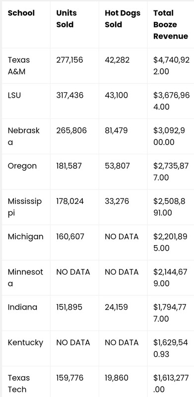 Texas A&M generated the most total alcohol revenue at home games during August, September and October, according to reporting by Matt Brown of the Extra Points newsletter.