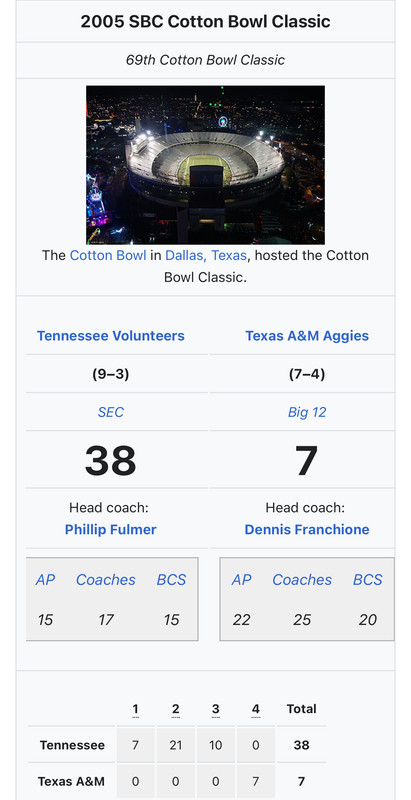 Played again in 2004 in the Cotton Bowl. A&M lost that one bad 38-7. TennerC was ranked #15 at the time. A&M was unranked.