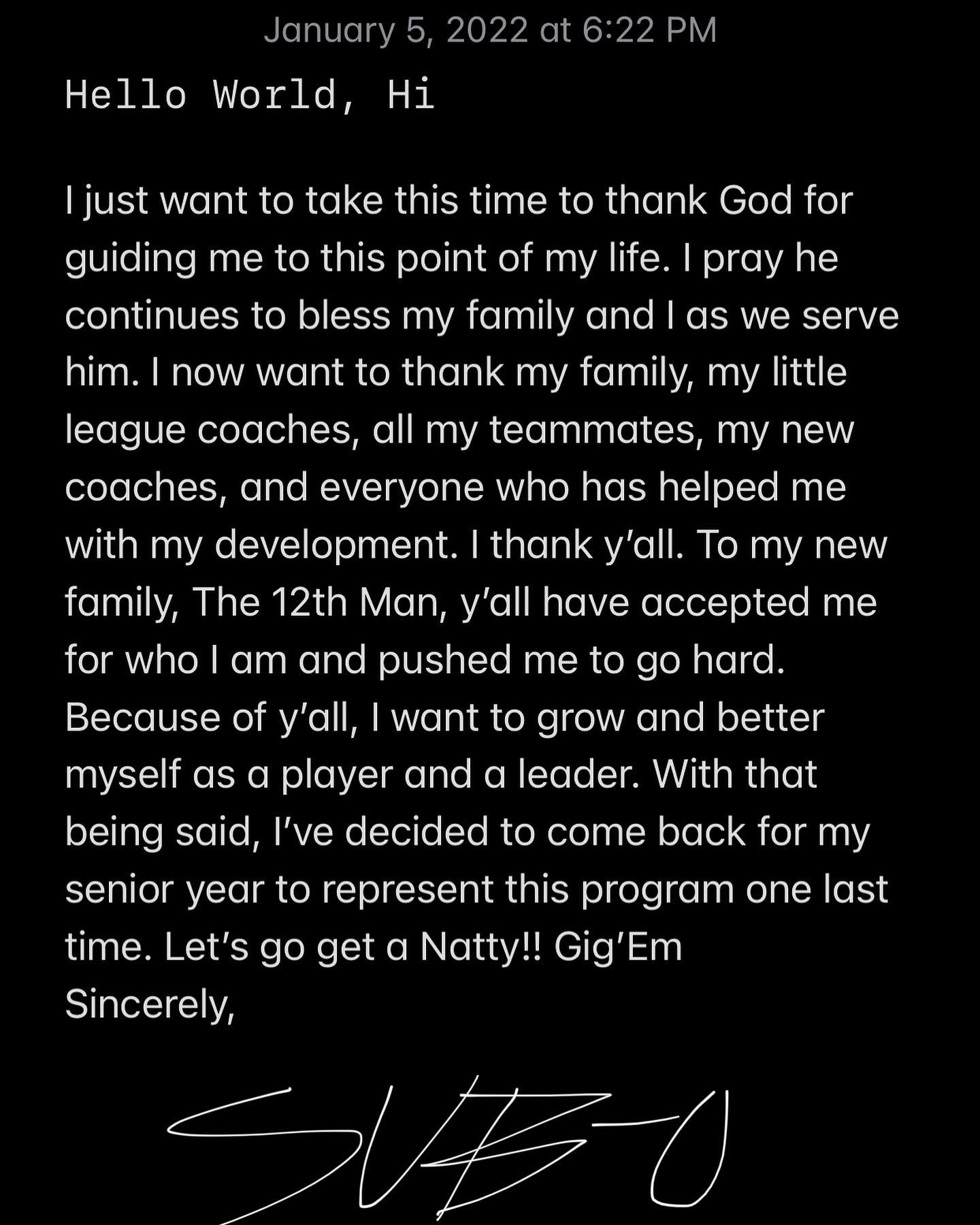 He’ll make more money at A&M than being a late round draft pick. Good choice.