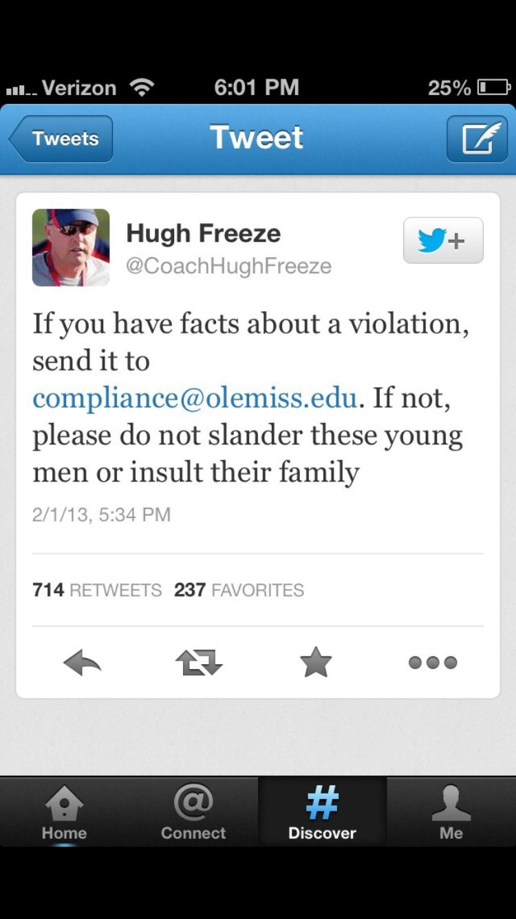 At first you Ole Miss fans said there was nothing to the NCAA investigation when Hugh Freeze was Coach it was all under Houston Nutt and nothing would happen. Freeze even had the world famous tweet about it. The Ole Miss got hammered the Freeze fired for screwing escorts all over the country. The worst case outside of SMU. Freeze was so dirty he is blackballed from the SEC.