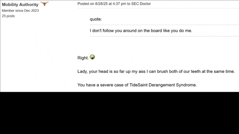 Bless your heart, Chex. Why would I care about TideSaint getting caught with an alter? You think having an alter is worse than being a welching loser? It isn’t buddy.