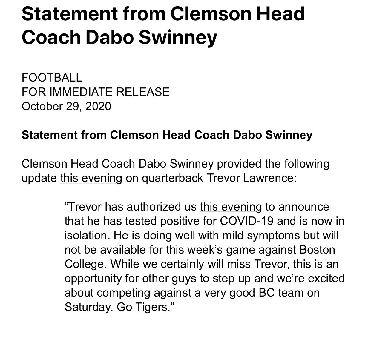 By the way, there’s no way he will be cleared to play vs Notre Dame next weekend unless it’s a false positive.