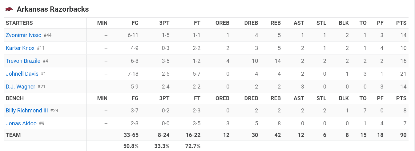 Arkansas' 90 points are the most a team has scored in regulation in Memorial Gymnasium all year.