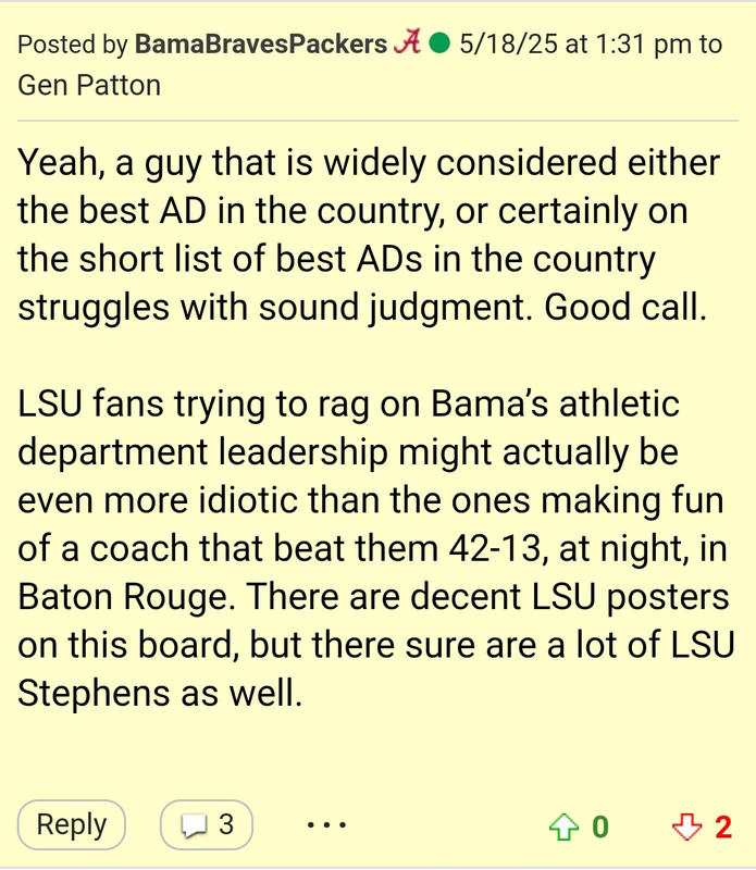 Show me a non-alter Bama poster that’s made fun of the Vandy or OK coach since they beat us. You can’t, because we aren’t stupid. Doesn’t mean we think they are better than DeBoer. Logic is hard for some LSU posters, and having balls to back your posts is even harder apparently.