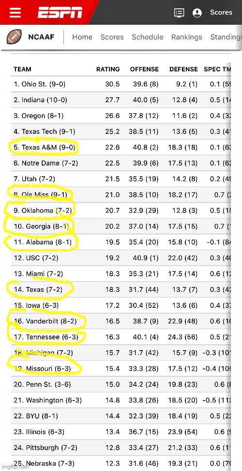 Important to note that this system still holds the old “eye test” or how impressive of a win a team has, which is sort of outdated thinking in the new world of college football that we have today. In the words of Al Davis, “just win, baby!” The graph shows that 9 of the top 25 are in the SEC. Realizing that not all 9 of the SEC team will be in the playoff, this list is a pretty good indication that the SEC will be well represented with the highest number of bids.
