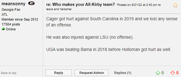 You did find a post of me debating to another dawg fan which injured WR was more impactful for our offense when healthy. UGA fans are definitely a different breed than gumps. That is for sure.