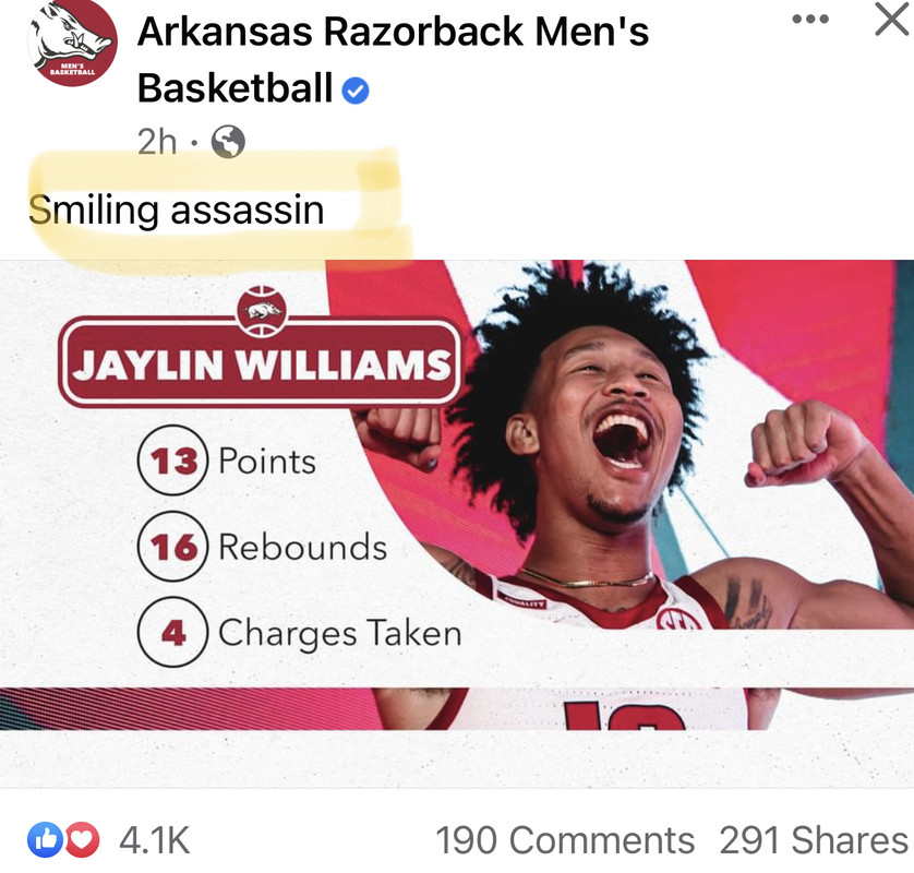 C'mon, a UT fan shouldn't be complaining about another Williams getting favorable treatment from the refs. I remember Grant Williams getting similar treatment at UT, and fans of other teams hated that as well. Not that I'm disagreeing that Arky's Williams gets favorable treatment. He does, and he's also a major league flopper. He's a very good player, so why the need to be flopping around like a beached whale? I guess he knows the refs will reward him.