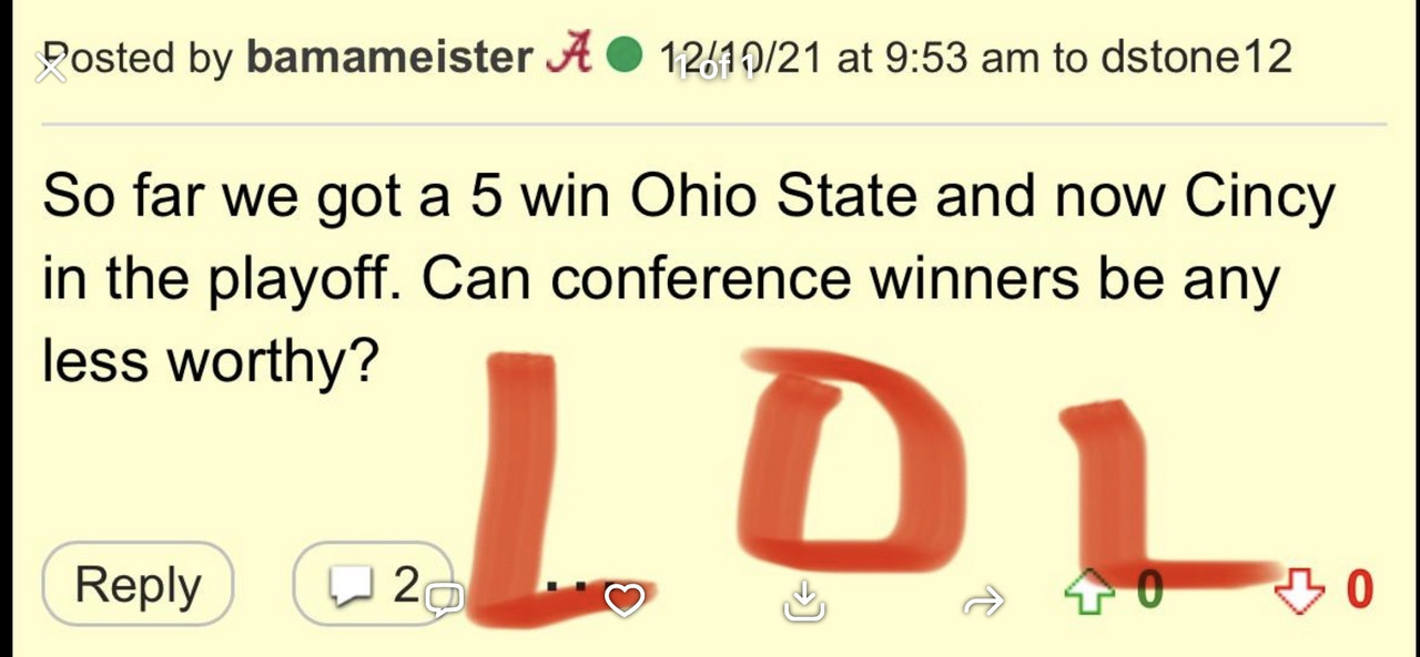 Just take your title and quit trying to convince the rest of us this was some sort of all time great team. Nobody but you little Bammers is buying that a team that playes in half empty stadiums against teams with opt outs and won it all against a 6 win team belongs on any of those lists.