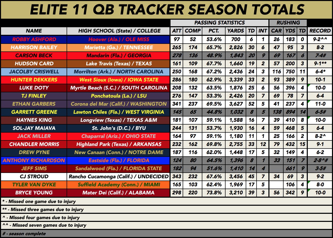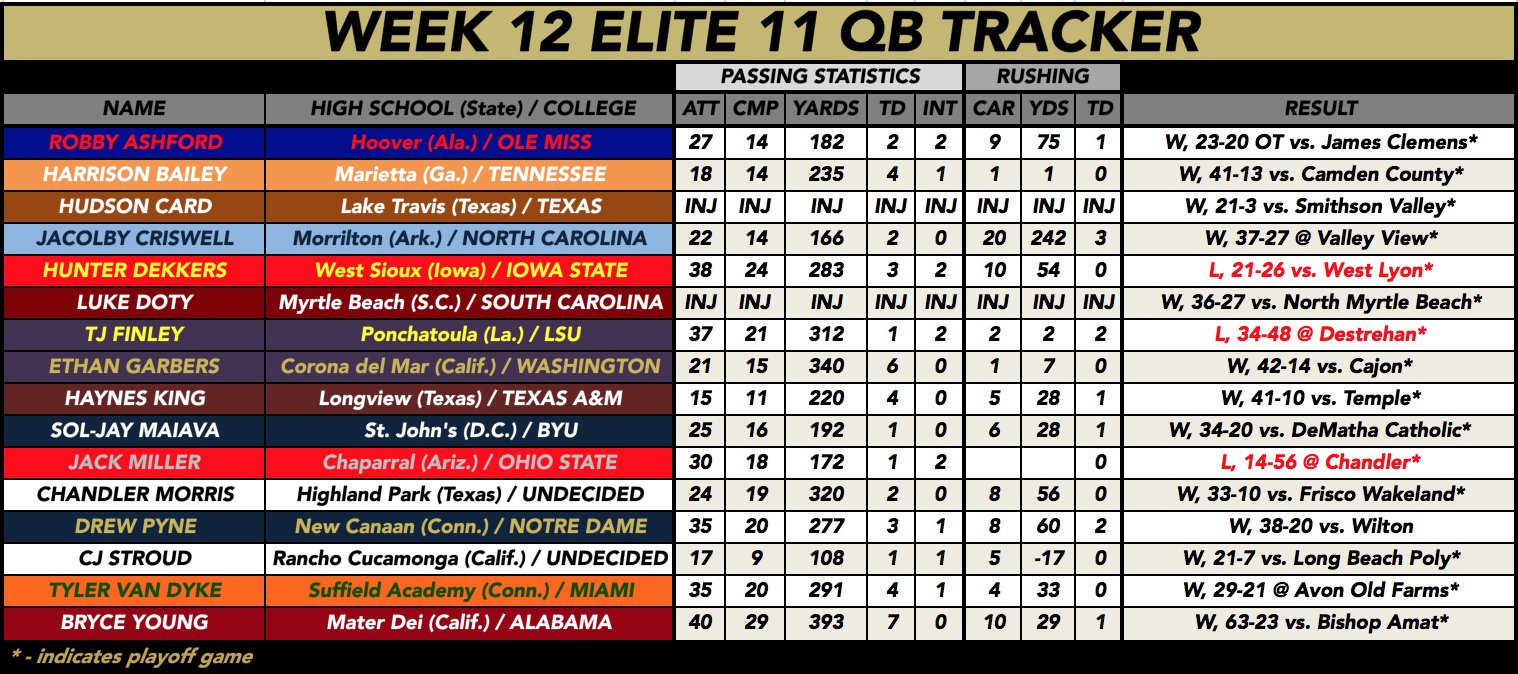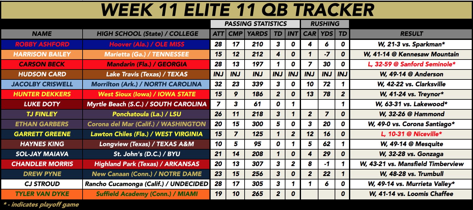re: *** Season Long Stat Tracker for Class of 2020 Elite 11 Quarterbacks - 11/20 Update ***