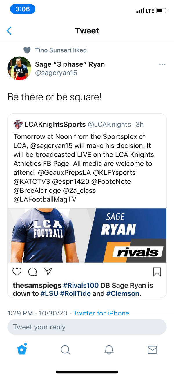 re: '21 5* Sage Ryan (LSU legacy) commits to LSU on Halloween