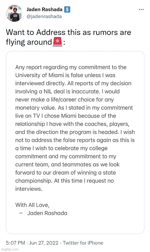 This after a few months of reports that Miami had a 10$ Million NIL deal set for Rashada.