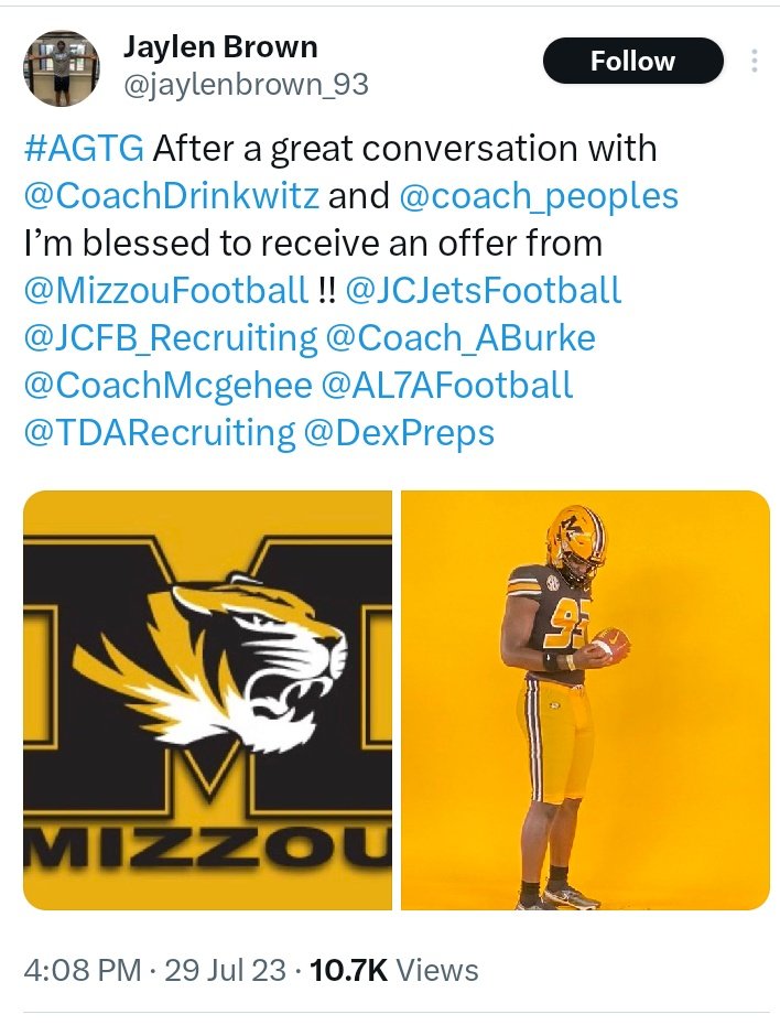 The MU offer went out as soon as it came out he would not be visiting MU before his commitment. Mizzou insiders only thought they had a shot if he made it back to campus Monday.