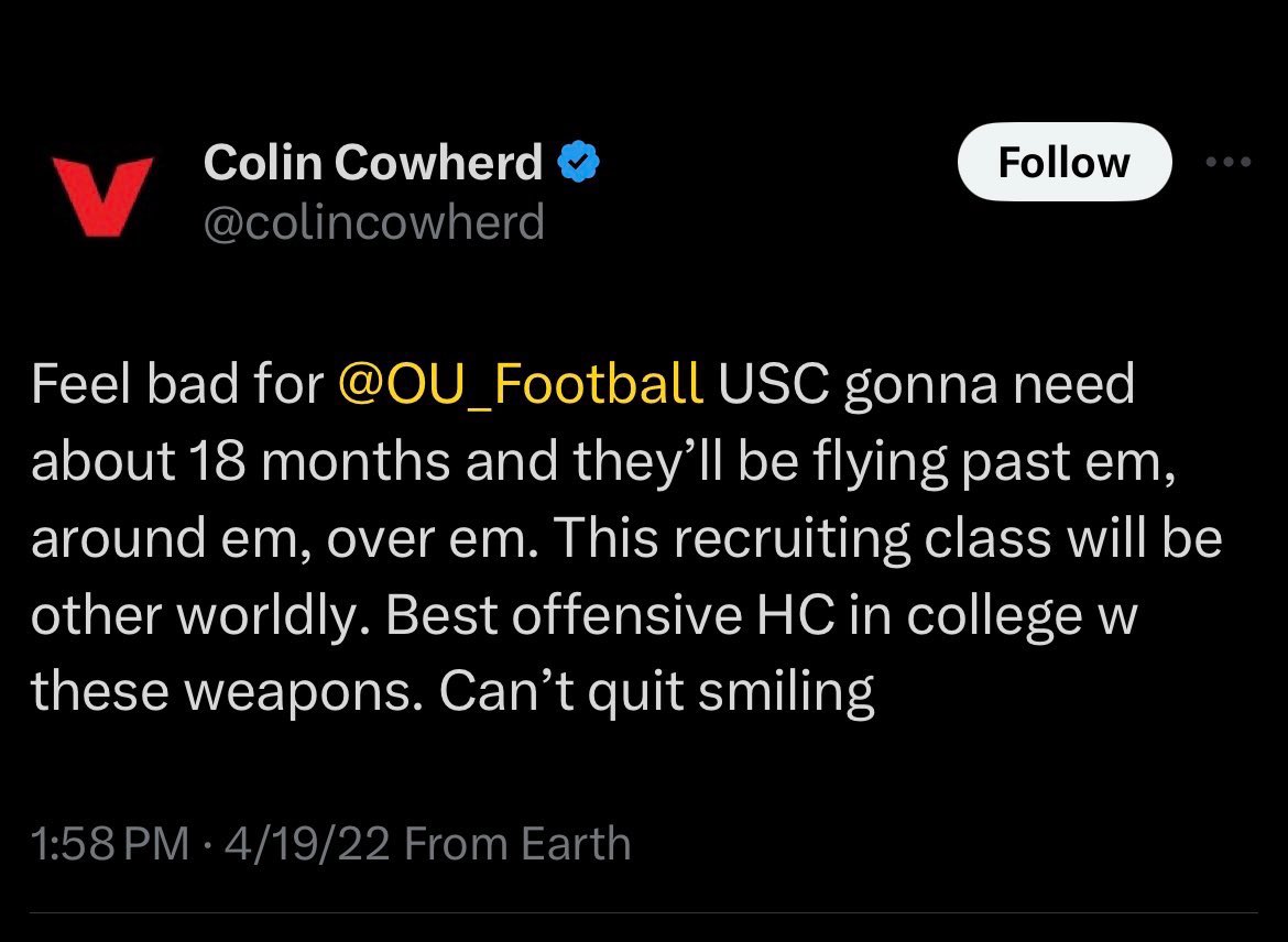 As stated, OU fans get satisfaction anytime USC fails. Here’s a post from 2022 that keeps on giving
