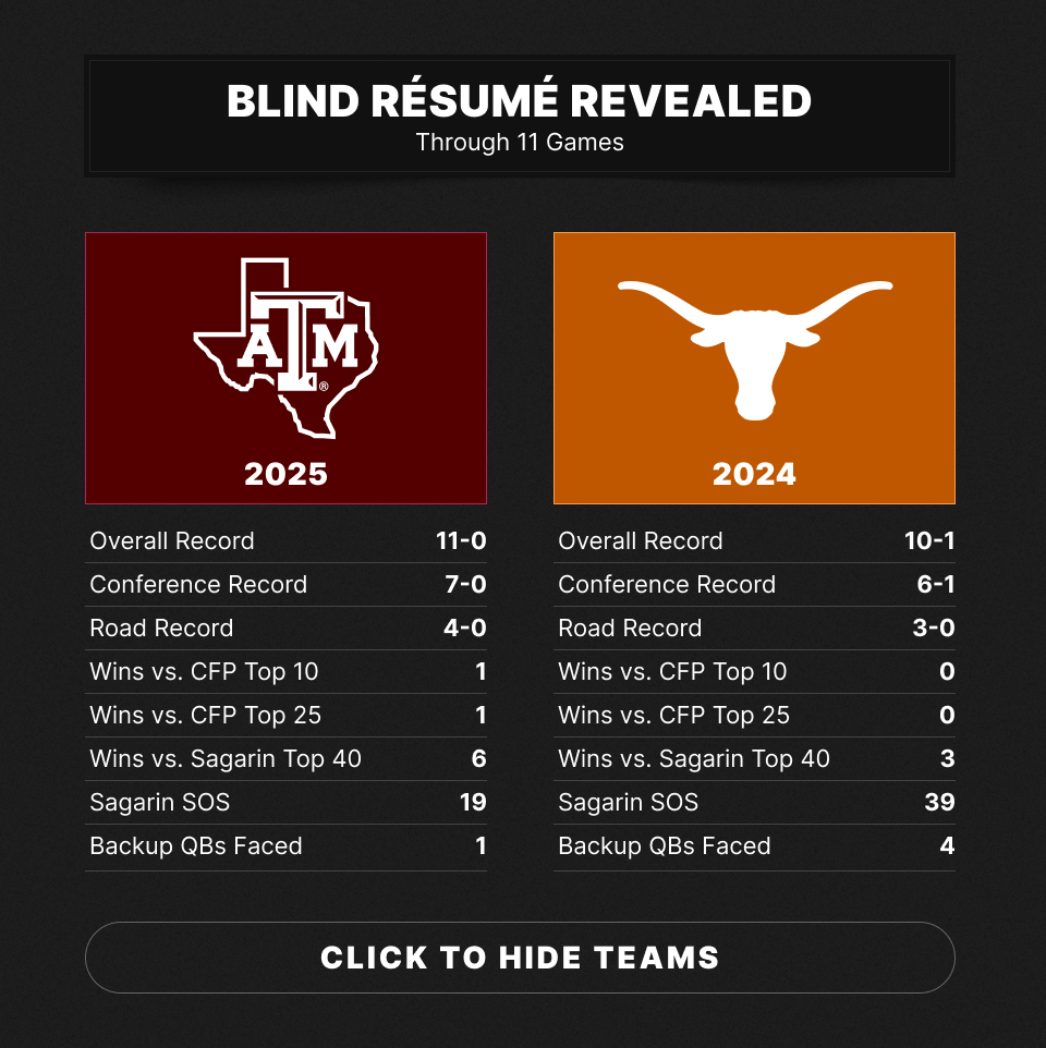 The link compares 2024 Texas to 2025 Texas A&M. Last year Texas did not beat a top ten team. Had three less top thirty team wins. Who did Texas beat last year that was so good? And yet they made it to the semis. Not saying A&M will but here you are again ripping the Aggies.