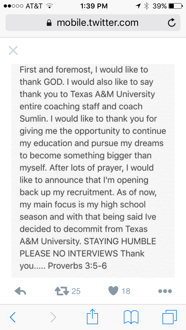 “I still love Texas A&M, but I want to think things through. They are still a school that I’m really high on, and I’m still considering them.”