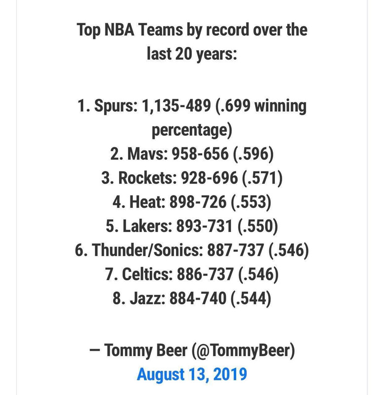 I mean, there are full grown adults in Houston that have never seen the rockets even win the West, while watching San Antonio or Dallas host the past 23 consecutive NBA Finals games played in the state of Texas. 20 years is statistically significant.