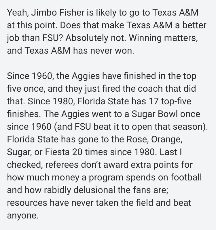Does that make Texas A&M a better job than FSU? Absolutely not.