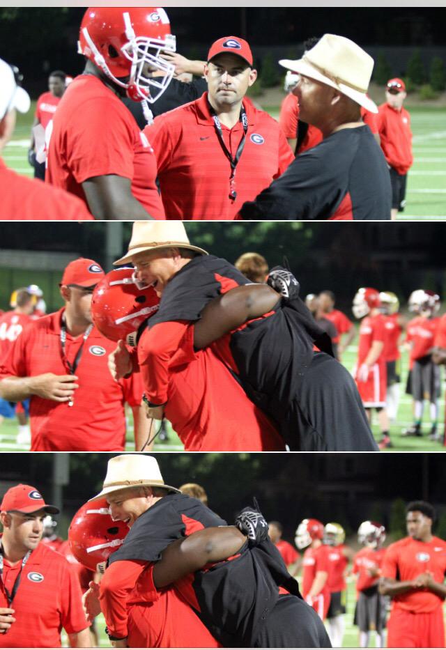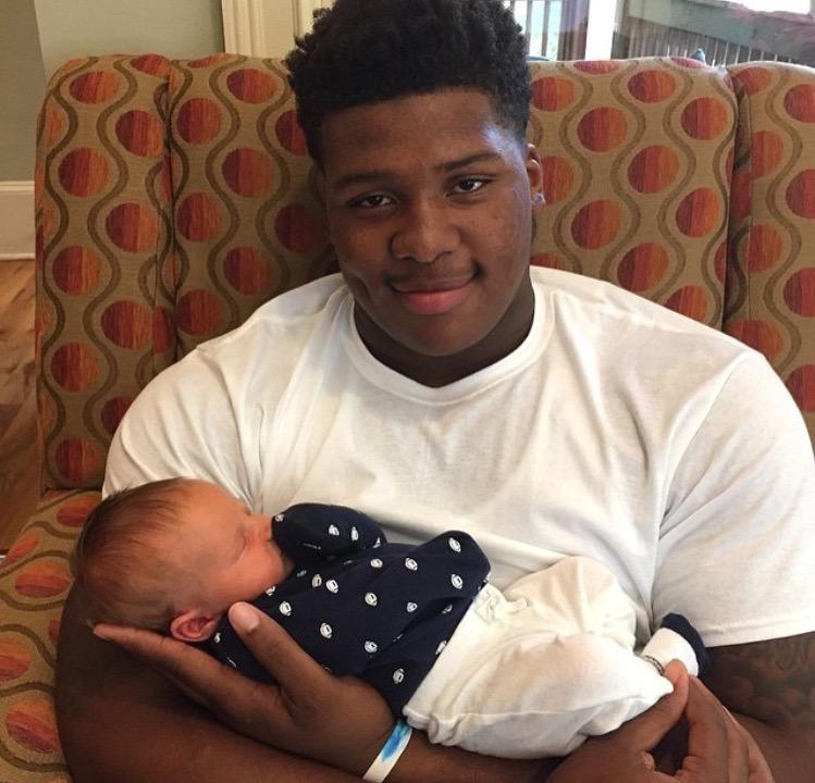 #UGA DT Trent Thompson, the nation's top prospect in 2015, holding #Georgia DC Jeremy Pruitt's baby boy, Ridge.