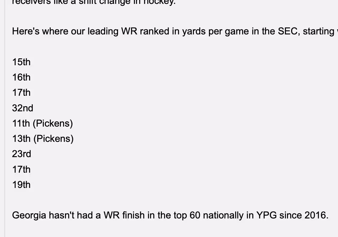 Georgia hasn't had a WR finish in the top 60 nationally in YPG since 2016.