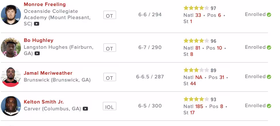 I already knew that our pedigree at offensive linemen wasn't what it once was. Had 2 years there where we had 5 different 5 start O linemen on the roster. Now we have Ratledge and maybe Freeling, depending on the recruiting service. But when he went down the list of 2022 and 2023 offensive line signees and wondered if our coaches "just took 2 years off recruiting offensive lineman," I realized that our future definitely isn't as extremely bright in the future as I thought it was heading into this season, at multiple positions. Nothing personal against Griffin Scroggs, but the Griffin Scroggs signing is the poster child for our lazy offensive lineman recruiting and something that gives off serious flashbacks to the Richt days, when we sign any 260 pound offensive lineman with a bad shoulder and a pulse off the street or the O lineman from the private school in Valdosta just for shits and giggles.