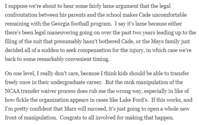 I hate to say this ..... but we’re about to find out if there are any shenanigans going on with recruiting. You have the parent of a recruit...suing UGA looking for $$......looking to transfer...and discovery being discussed.