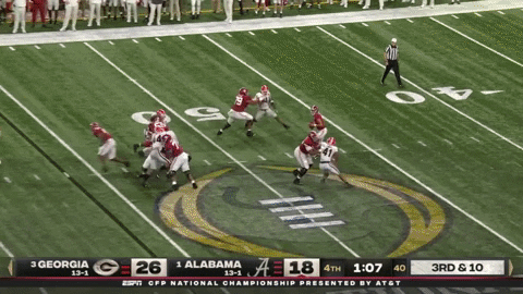 LINK and the 10:34-35 second mark in this one of the pick 6. You see the ball go through the camera frame and a Bama fan in a sea of red jumps up signaling TD, the the sea of Red erupts around him as he balls up in his seat with his hands over his head here: