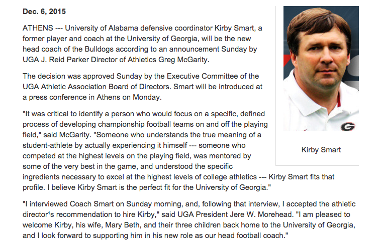 Kirby Smart officially UGA HC, Press Conference tomorrow AM
