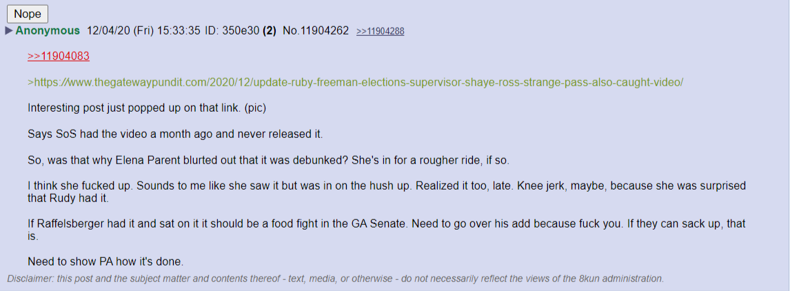 There was a GA senate hearing yesterday with a bunch of Trump lawyers. The night before, they finally got access to the State Farm Arena surveillance videos of the counting room there. The video clearly showed that all watchers/monitors and most employees were sent home because of a "water main break" and that counting would resume the next day. But four people stayed back. They pulled out boxes of thousands of ballots from under a table, not from the larger pile of boxes of ballots that workers had been pulling from all day, these were special in some way. They proceed to jam them into the scanners for hours. All of which isn't just unethical, but violates state law. Even if every ballot they counted was legit, it's still against state law to count them with no monitors present.