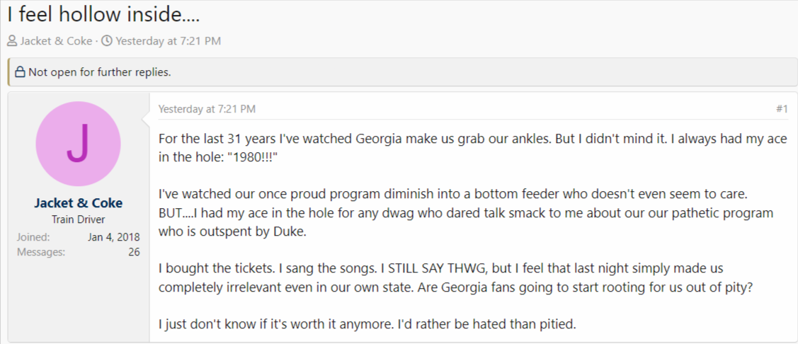Tech is THE Institution. We take the good with the bad ( we all know there is way more good than bad ), knowing that next year gives us the opportunity to knock off the defending champions. That is what we need to be focusing on because history is written already, but there is no better middle finger than beating their arse in every aspect of life going forward. To Hell With georgia.