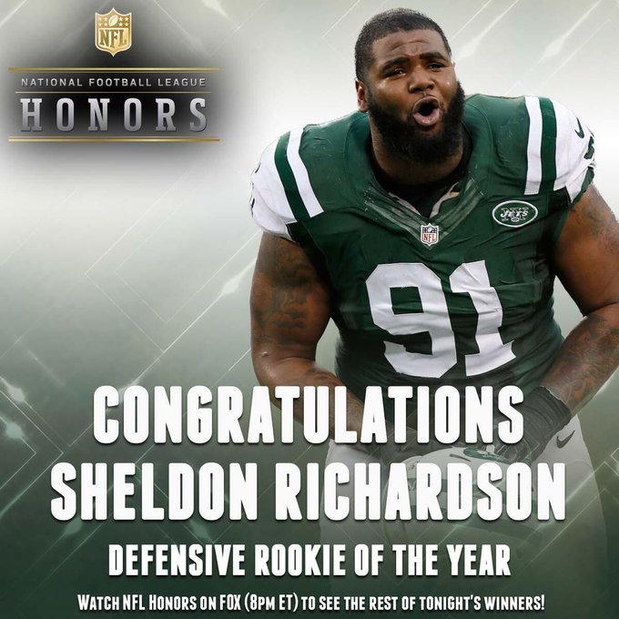Congratulations to Sheldon Richardson! 2013 Defensive Rookie of the Year! #NFLHonors pic.twitter.com/4GYjElYmgH