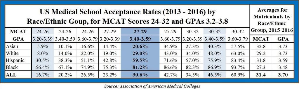 Matriculation statistics for medical schools were posted annually by race up until at least a few years ago. It was eye opening and really frustrating to learn that MCAT and GPA averages of those accepted differed wildly by race. It was such a huge delta that the only explanation was that the system is, in some ways, expecting far more from Asian and white applicants.