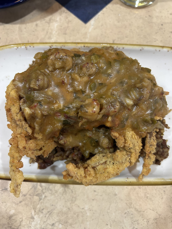 Jason Seither just whipped this up for me. Crawfish etouffee over a fried soft shell crab.